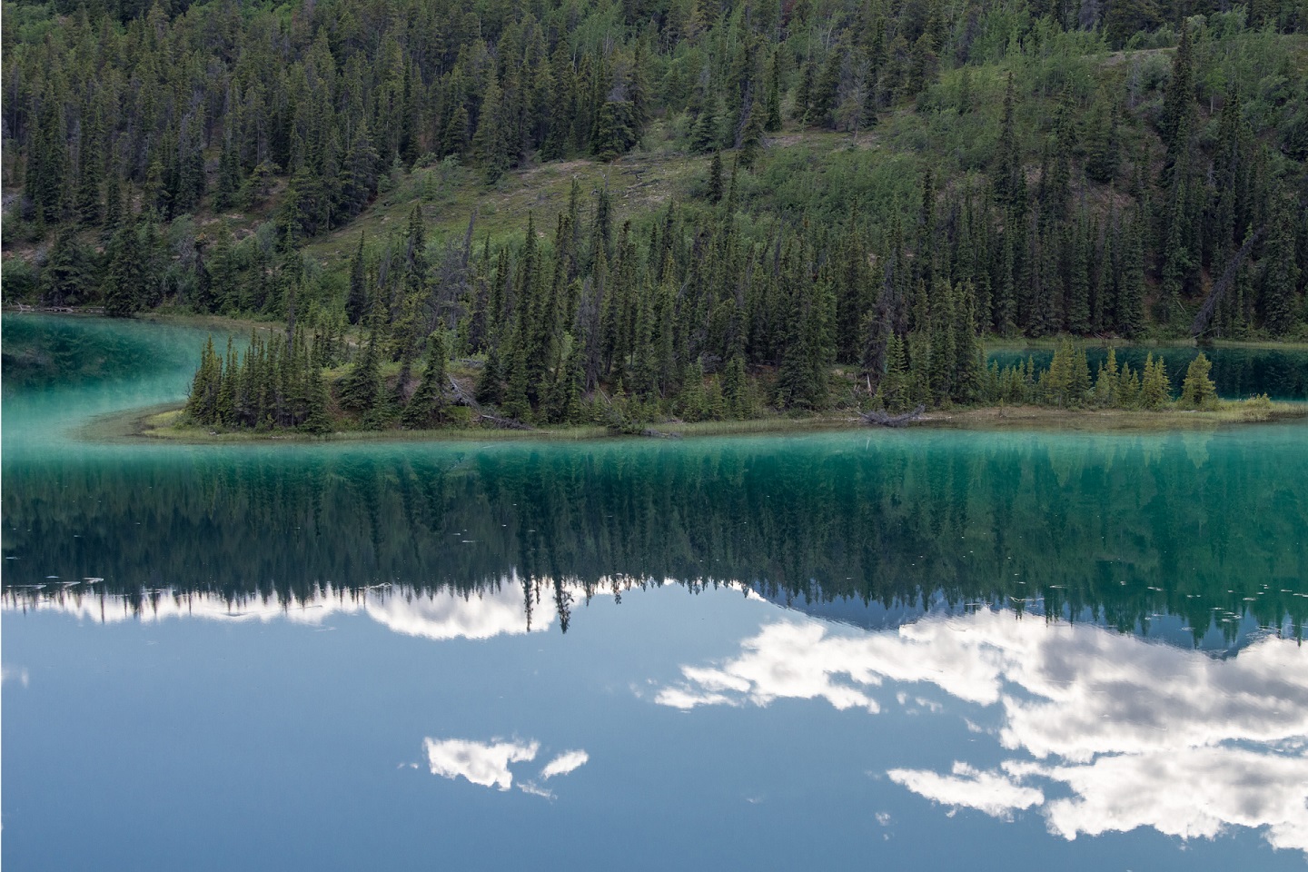 Reflection of the sky in beautifully colored water, on the way to Whitehorse.